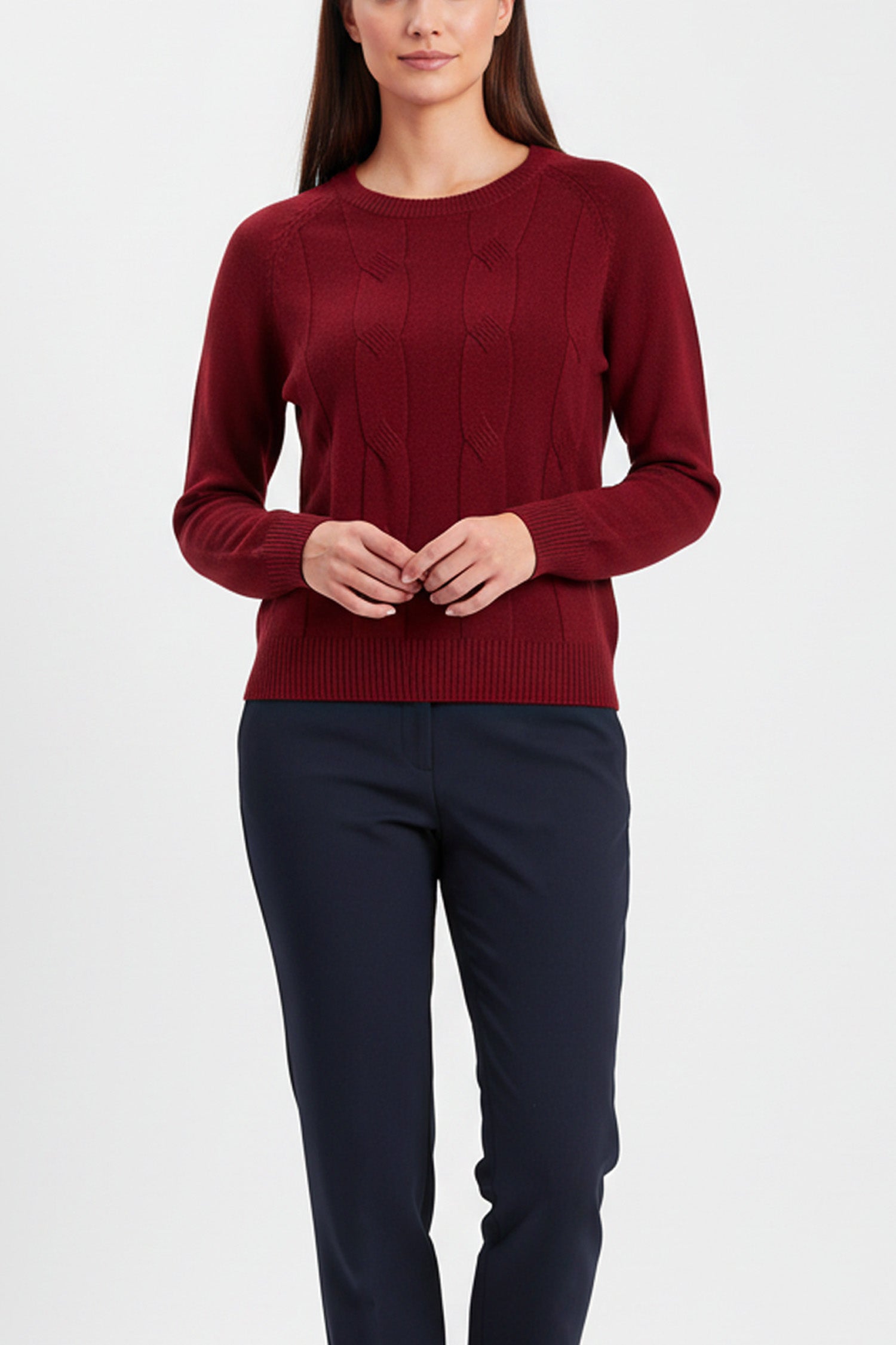 A soft, everyday cable knit made in a timeless crew neck shape. This jumper offers warmth without bulk, with a neat ribbed hem and cuffs that sit comfortably against the body. The cable detailing gives subtle texture while keeping the look clean and easy to wear. A style that works with trousers, denim or skirts — ideal as a daily staple through the cooler months.