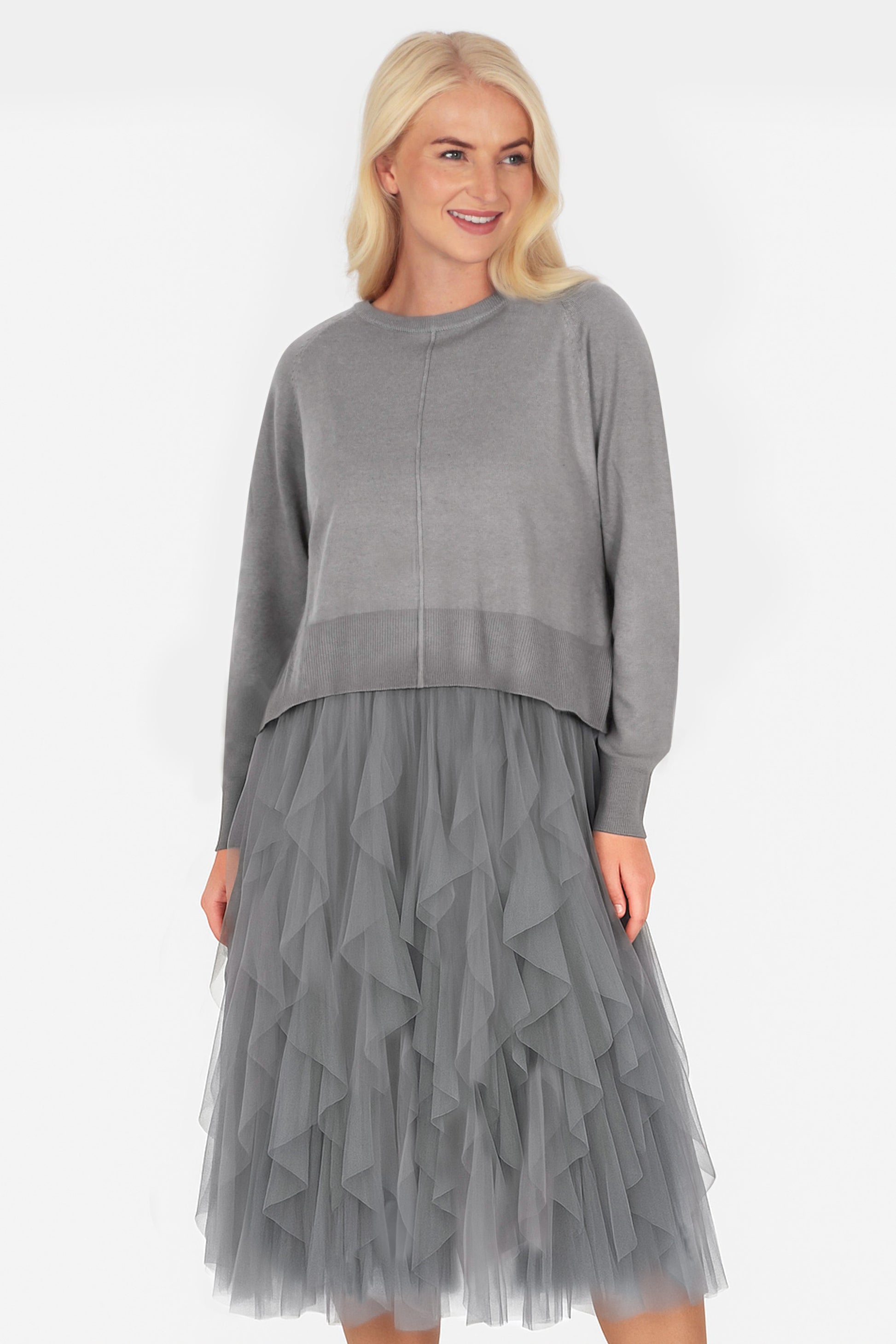 Our two in one Italian dress style is an effortless throw on and go solution. Featuring a relaxed crop fit over jumper with tie-back detail and a lightweight frill detail skirt underdress. Looks great dressed up or down. effortless style...