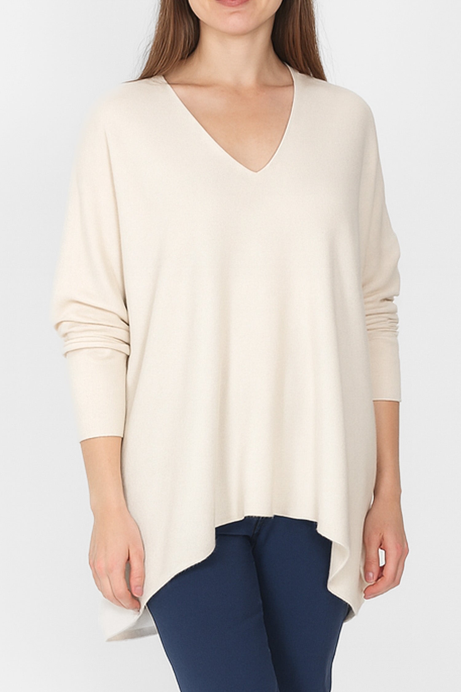 An effortlessly relaxed knit, the Cloud One Oversized Jumper is crafted from our signature soft plant-based blend, offering a feather-light feel with just the right amount of drape. Designed with a flattering V-neckline and a fluid high-low hem, it falls loosely effortlessly to create an easy, oversized silhouette. The fine knit texture makes it perfect for layering, while the simplicity of the cut ensures it pairs seamlessly with everything from trousers to skirts.