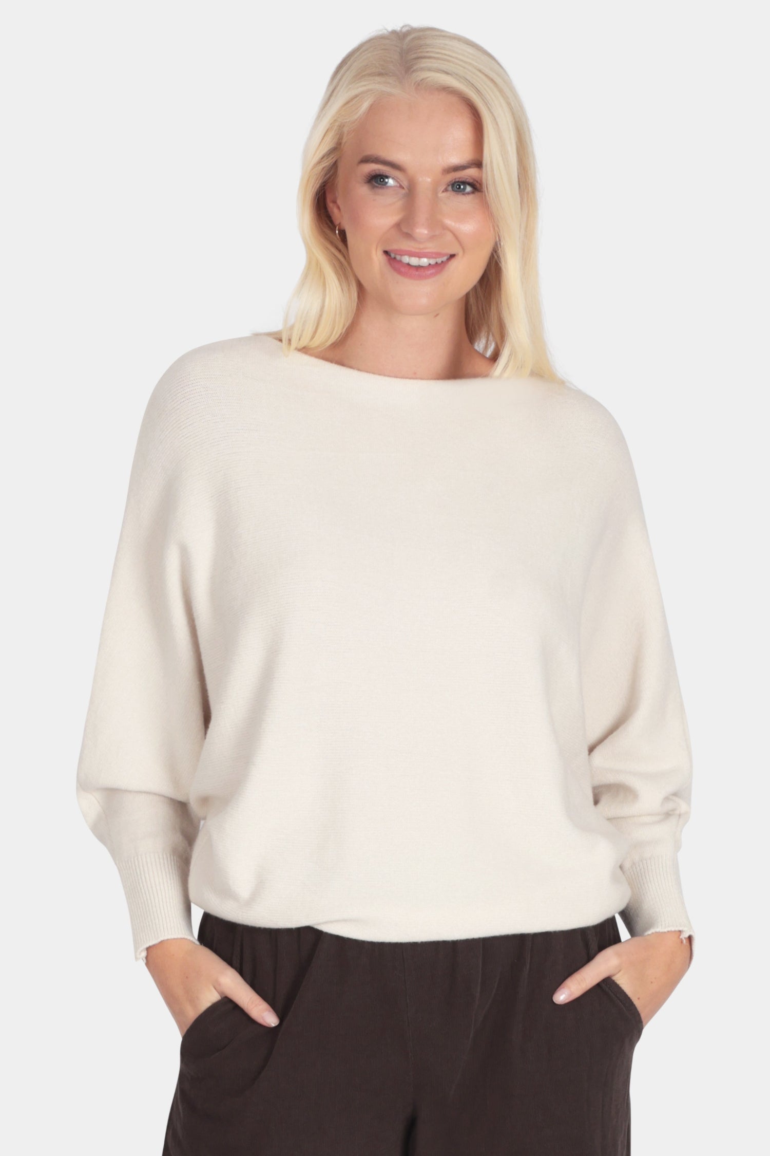 An Italian soft knit top made from Cloud Knitwear yarn. Featuring relaxed batwing sleeves and a flattering boat/slash neckline. Designed for comfort and ease, it drapes beautifully while keeping a refined silhouette.