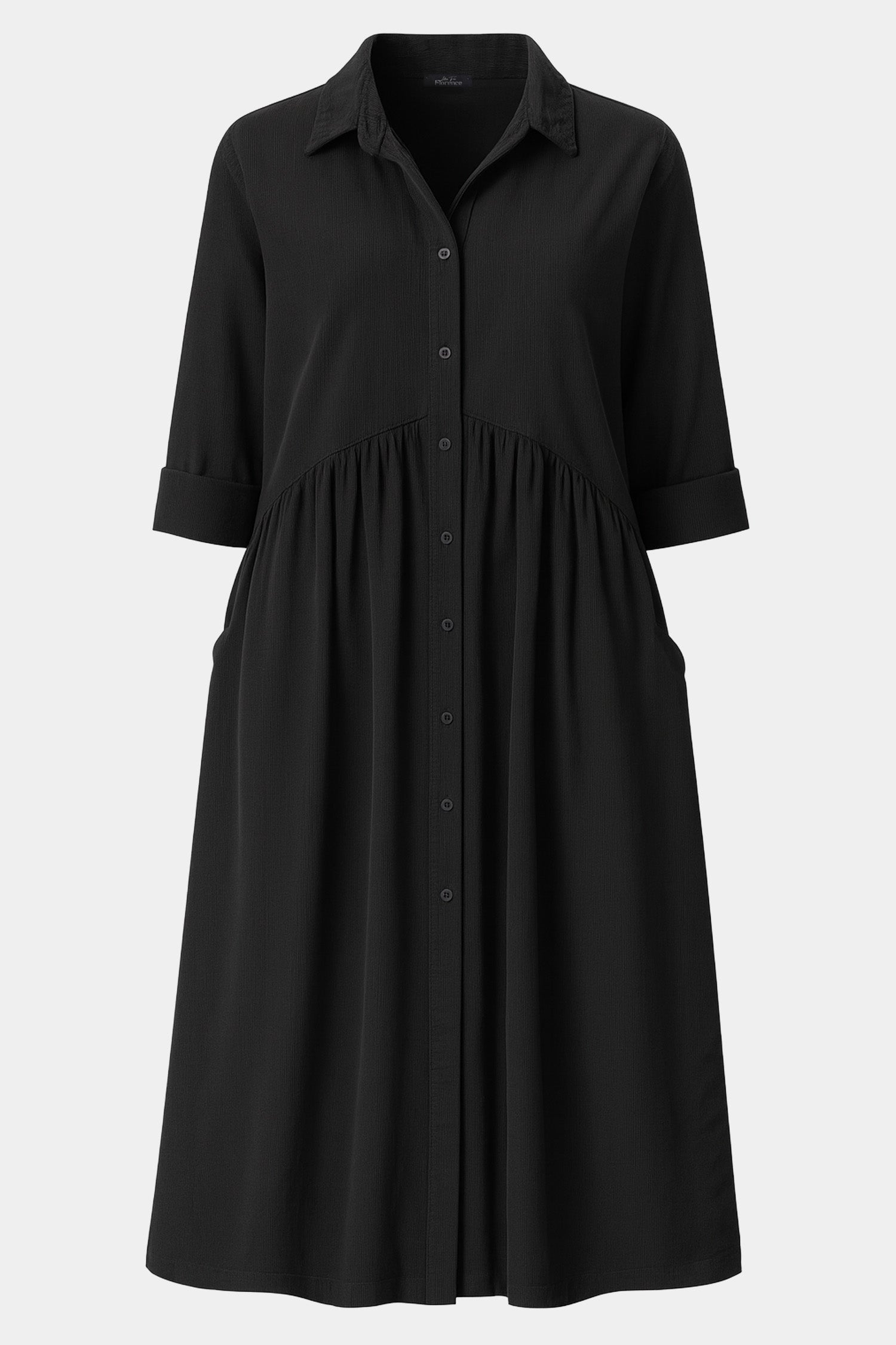 A soft and easy corduroy cotton dress made for everyday wear. Cut in a relaxed midi shape with a neat shirt collar and button-through front, it’s finished with gentle gathering for a comfortable drape. Turned-up sleeves and handy side pockets make it practical as well as stylish — an easy piece you’ll reach for all season.
