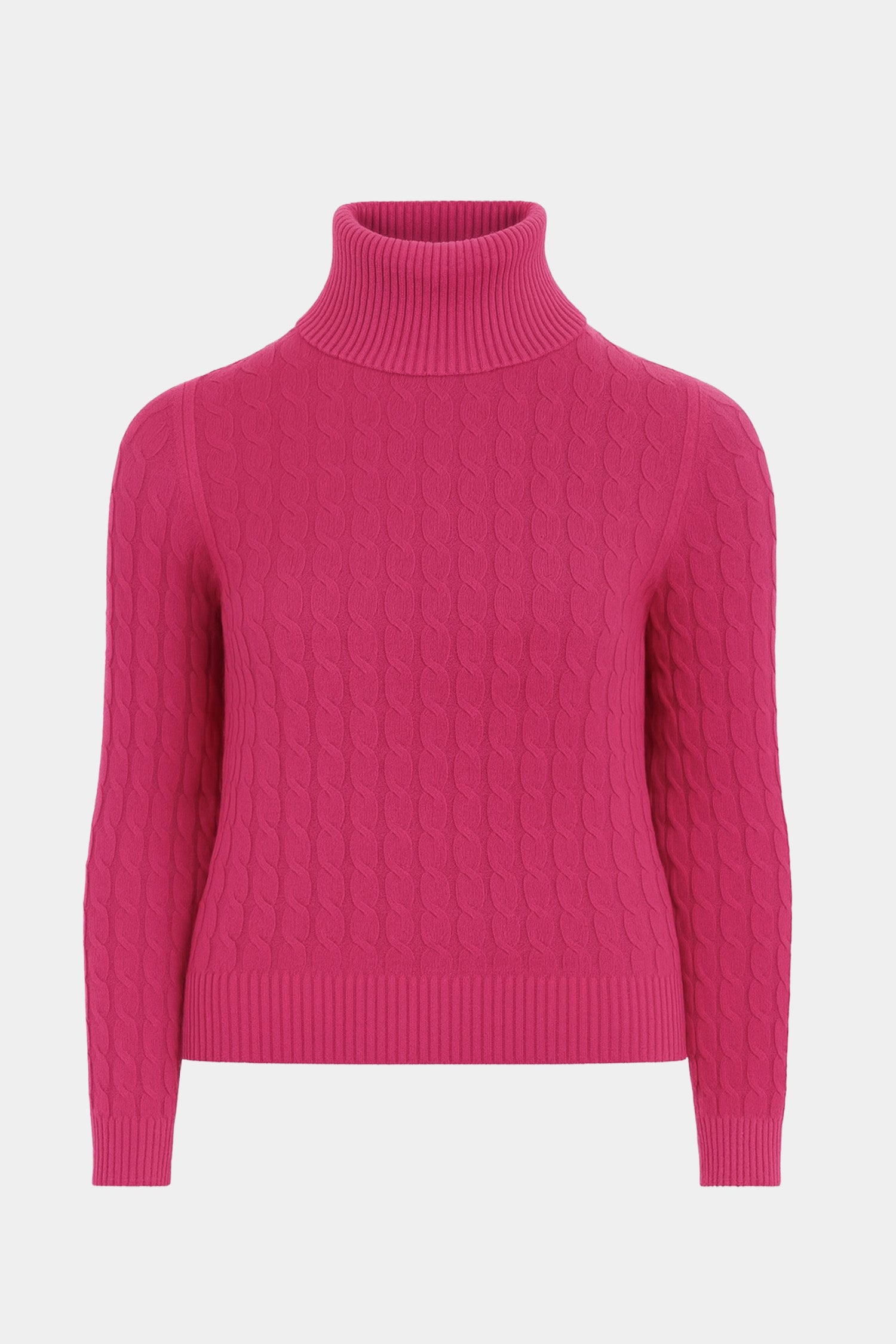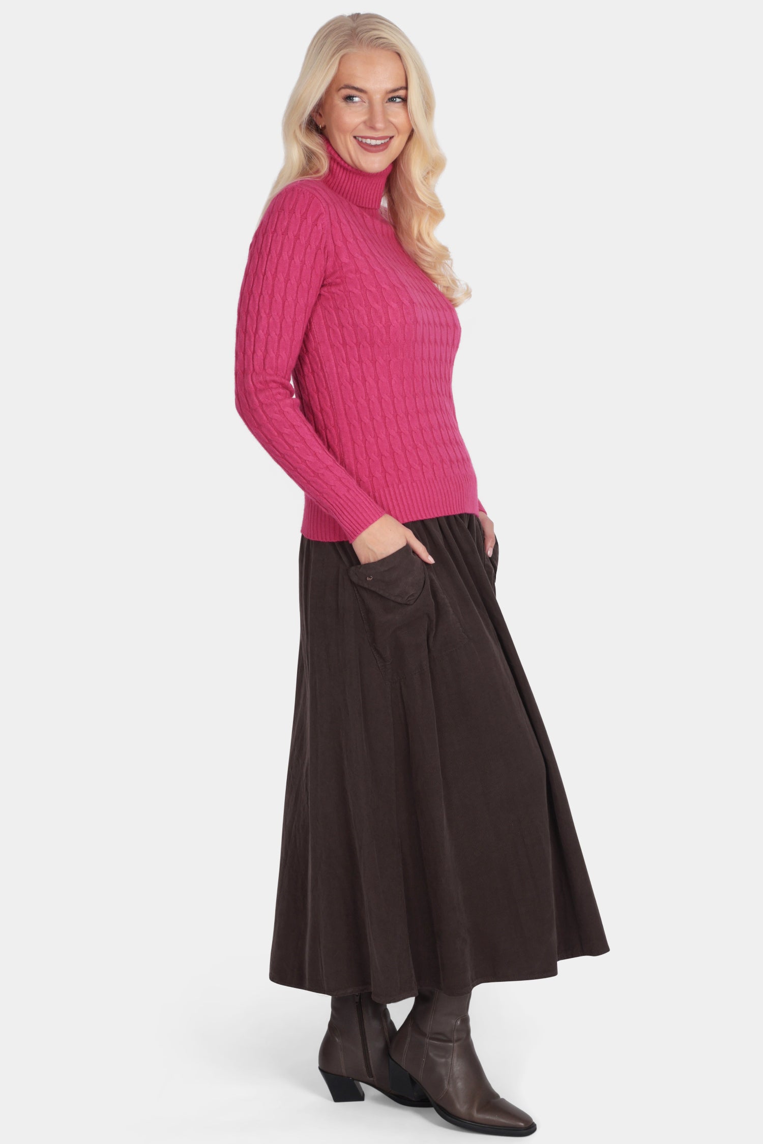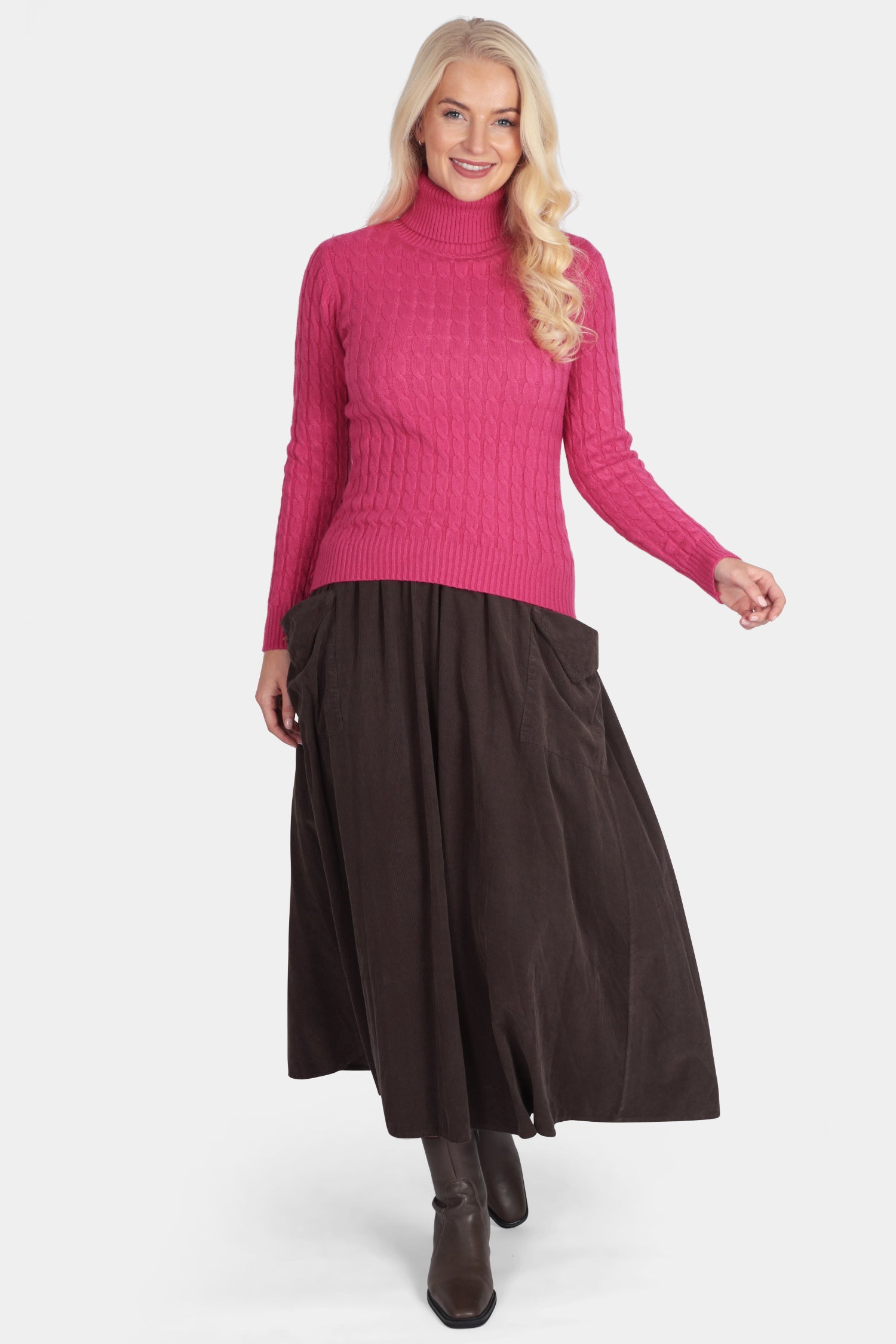 A soft, fitted roll neck jumper with a classic fine cable knit running through the body and sleeves. Designed to sit neatly on the figure without feeling tight, it works well layered under jackets or worn on its own with skirts and trousers. The ribbed hem and cuffs give structure, while the stretch knit keeps it comfortable and easy to wear.