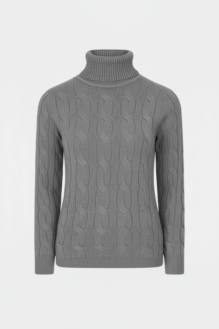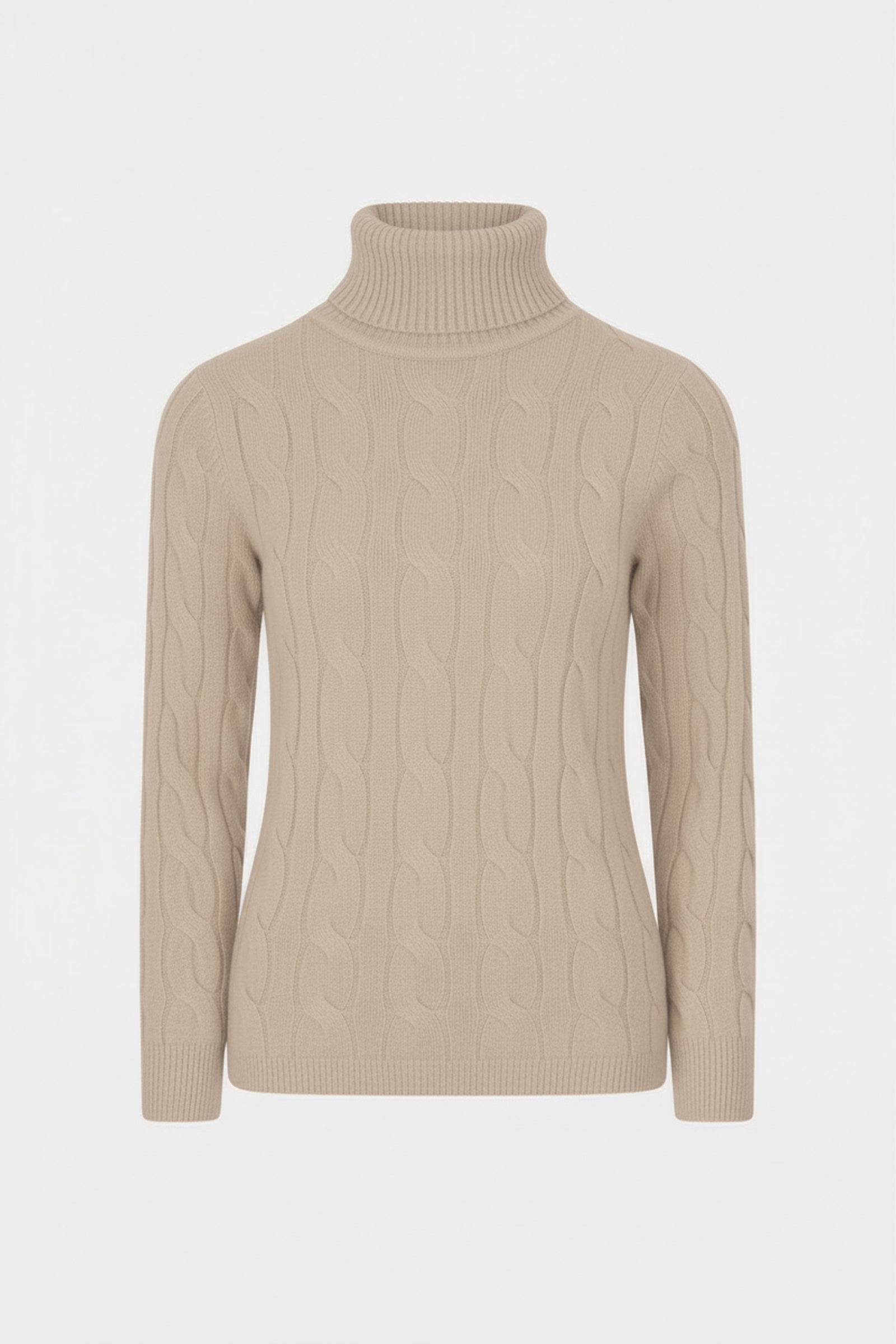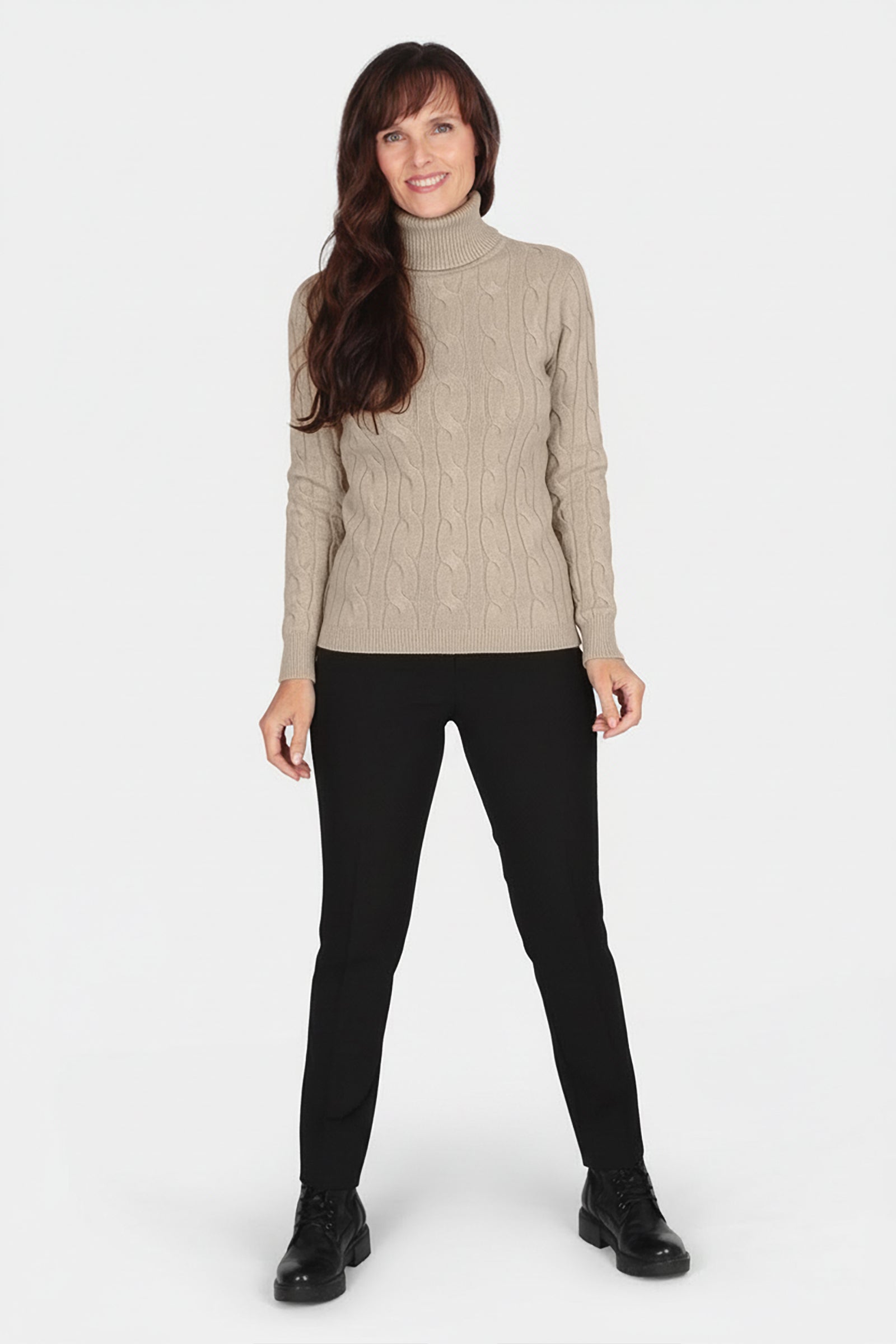 A warm and softly textured roll neck jumper, finished with a classic bold cable knit stitch. The neck is cosy without being tight, making it comfortable for all-day wear. Ribbed cuffs and hem give a neat silhouette while keeping the fit relaxed enough for layering. A simple, timeless winter knit that works with smart trousers, your favourite jeans or flowing skirts.