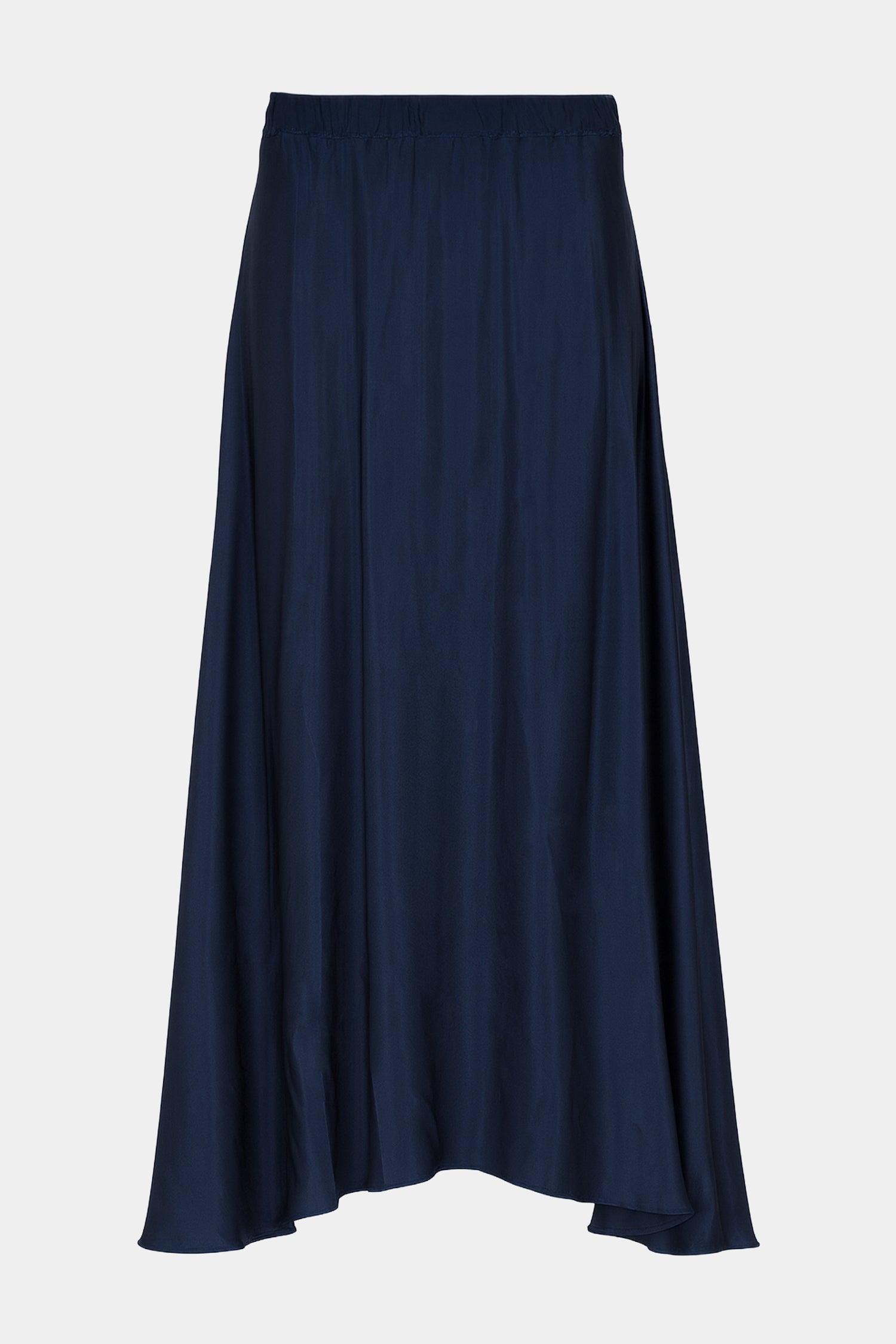 An easy pull-on skirt made from a soft silk-viscose blend with a subtle sheen. The cut is simple but effective: a comfortable elasticated waist, natural drape, and a gentle high-low hem that gives the skirt movement without feeling fussy. It’s light, fluid and works with both relaxed knitwear and smarter tops. A straightforward piece you can dress up or down.
