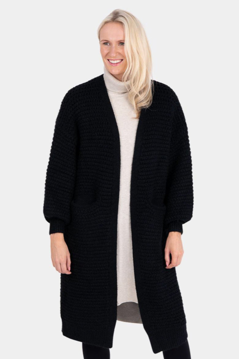 The perfect throw on layer designed for effortless style and warmth. This longline cardigan is crafted in a chunky textured knit with a relaxed, open front and generous pockets. Falling below the knee with a softly structured shape, it brings ease and comfort to everyday dressing.